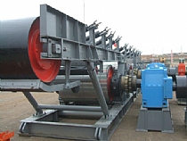 带式输送机是输送能力最大的连续输送机械之一。其结构简单、运行平稳、运转可靠、能耗低、对环境污染小、便于集中控制和实现自动化、管理维护方便,在连续装载条件下可实现连续运输。 该产品适用于下运物料输送。 其特点式托辊安装在固定的机架上,由型钢做成的机架固定在底板或地基上,整个机身成刚性结构。因此,它广泛用于要求设备服务年限长,地基平整稳定的场合。例如,煤矿地面生产系统、洗煤厂、井下主要运输大巷、港口、发电厂等生长地点。该种输送机应用十分普遍,现已形成系列产品如TD62、TD75、DTⅡ等。同时公司也在以下几个主要方面着手,力求做到最好。 A、提高带速,它是提高输送能力和节省投资的有效途径。 B、提高各部件的可靠性,也包括输送带的可靠性,往往一个部件的失灵会影响整机乃至整个系统的停顿。 C、努力减少维护工作量或取消日常维护工作,因带式输送机分布在几百米甚至几千米的运输线路上,很难实现有效的维护保养工作。 D、节能研究,带式输送机本身是输送机中耗能最省的,但在大型矿山、冶金、电力和专用港口等企业中带式输送机用量很大,成为企业中的一个耗能大部门,因而进一步的节能研究具有重要意义。例如,功率计算中的阻力确定,加大张力和托辊直径以及改进输送带结构与配方降低在运行阻力中占最大比重的压陷阻力 E、西方一些国家为适应金属露天矿型化的需要,正努力解决输送机输送金属矿石及其围岩的问题,以求用带式输送机替代昂贵的汽车运输。 F、对大中型带式输送机采用动态设计方法,通常采用的静态设计方法没有考虑输送带的粘弹性问题,因而输送机的起动与制动过程中会在输送带中产生冲击波,冲击波引起的输送带动张力要比正常运行的最大张力大10多倍,它直接关系着输送带的强度、接头强度、滚筒、传动装置和联接件的设计强度,然而研究可控的起动装置和制动装置来减小动张力便成为动态设计的根本所在。